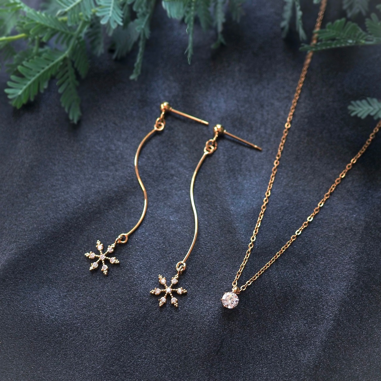 繊細に輝く雪の結晶が耳元でゆらめき、胸元には清らかに光る一粒の輝き