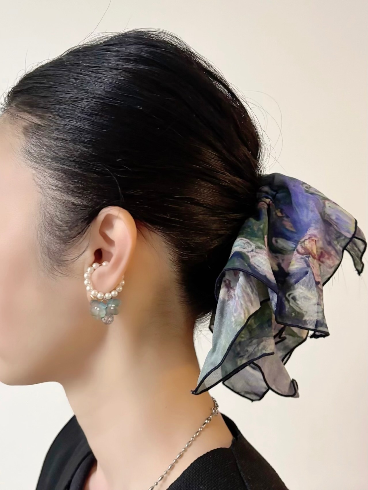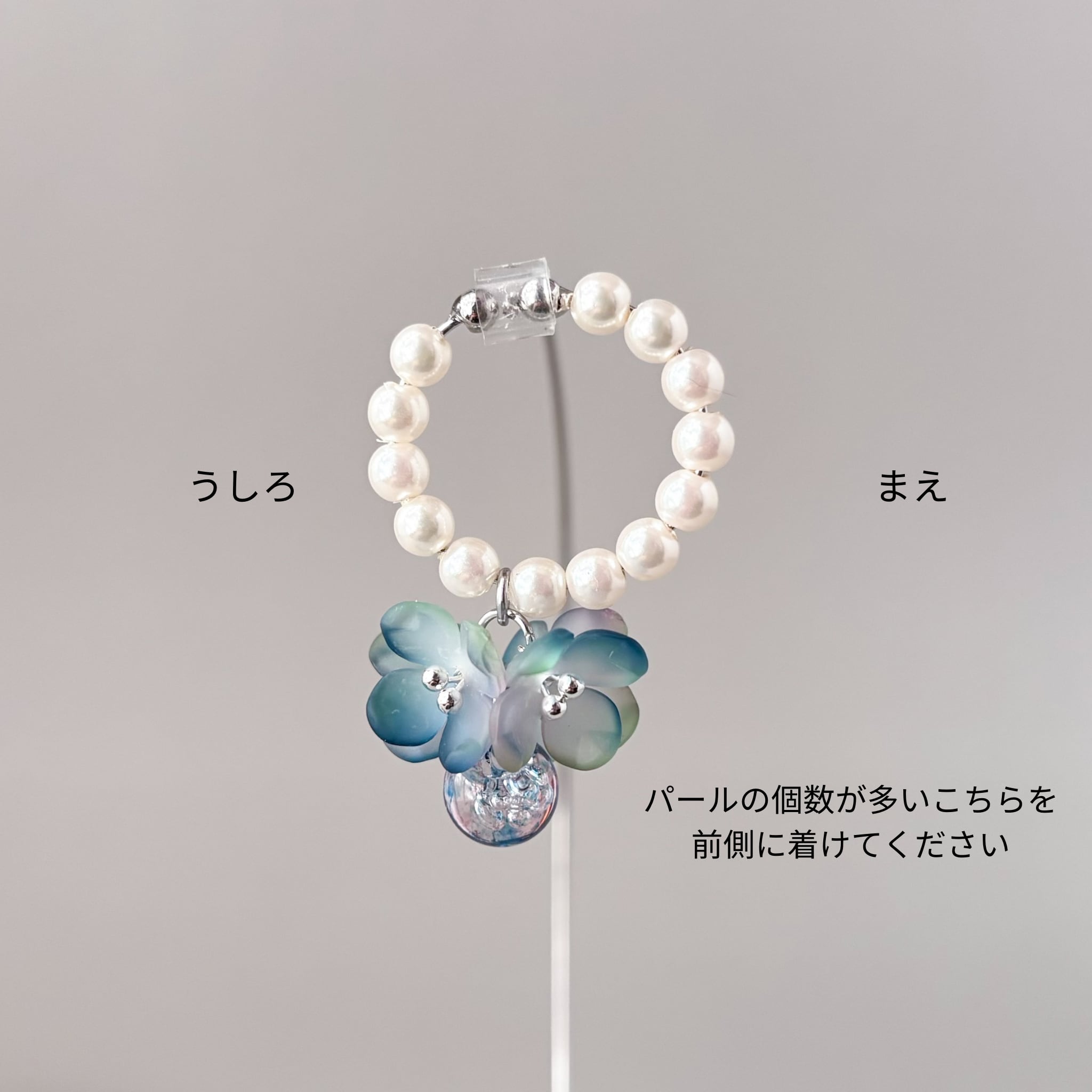 お花をはさんでパールの粒が多い方を耳の前側に着けていただくとキレイです
