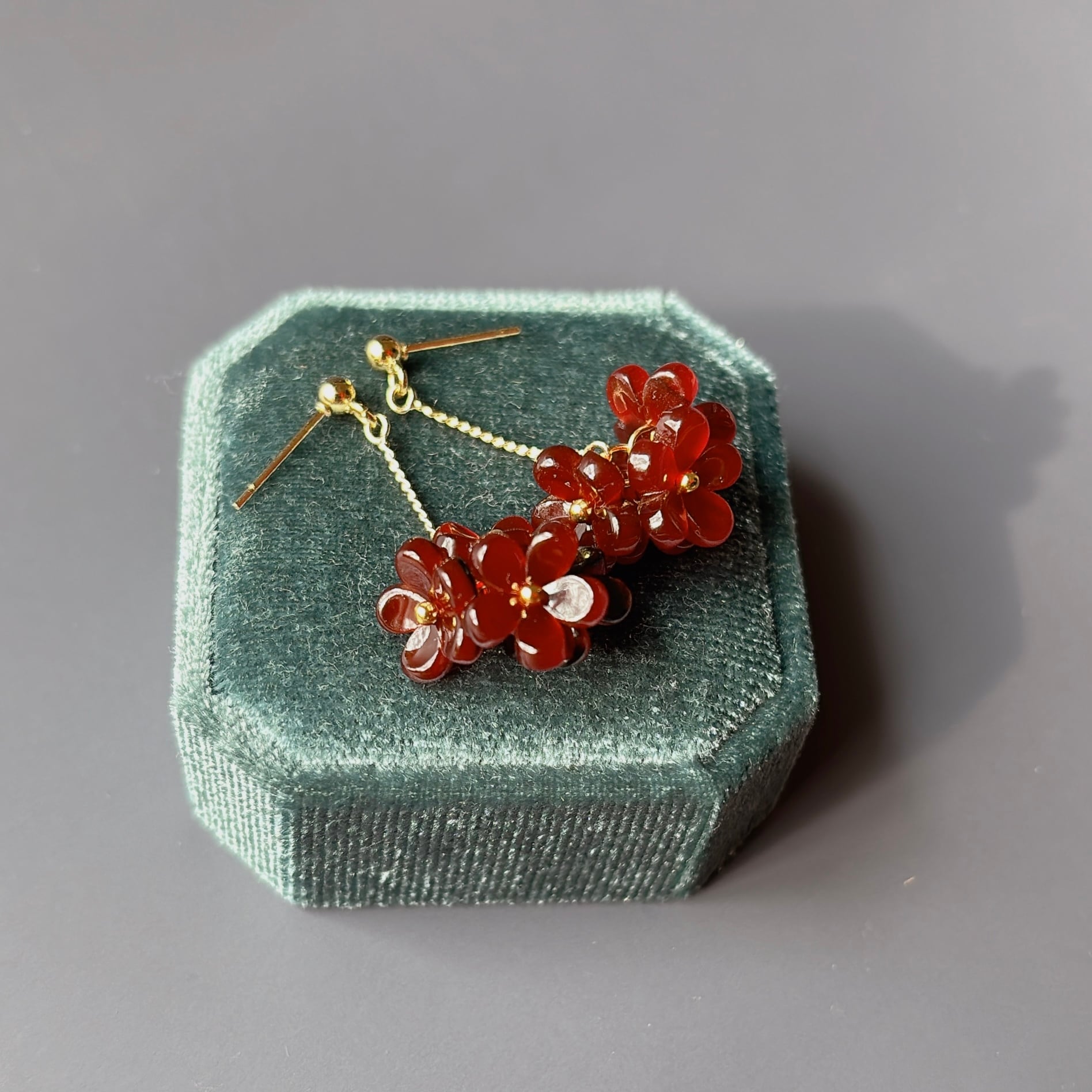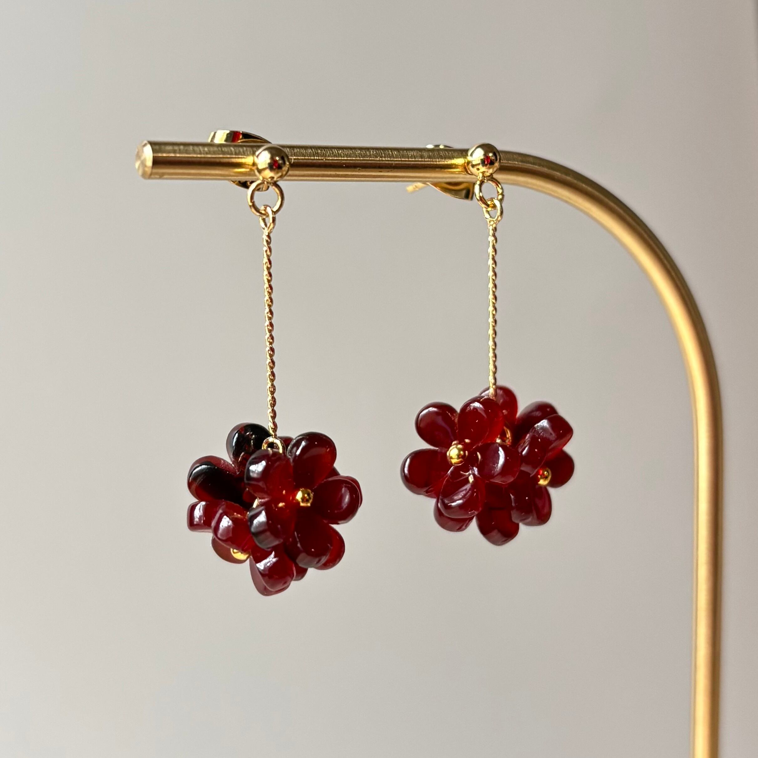 深いボルドーの花が、耳元でそっと揺れる大人のためのピアスです。