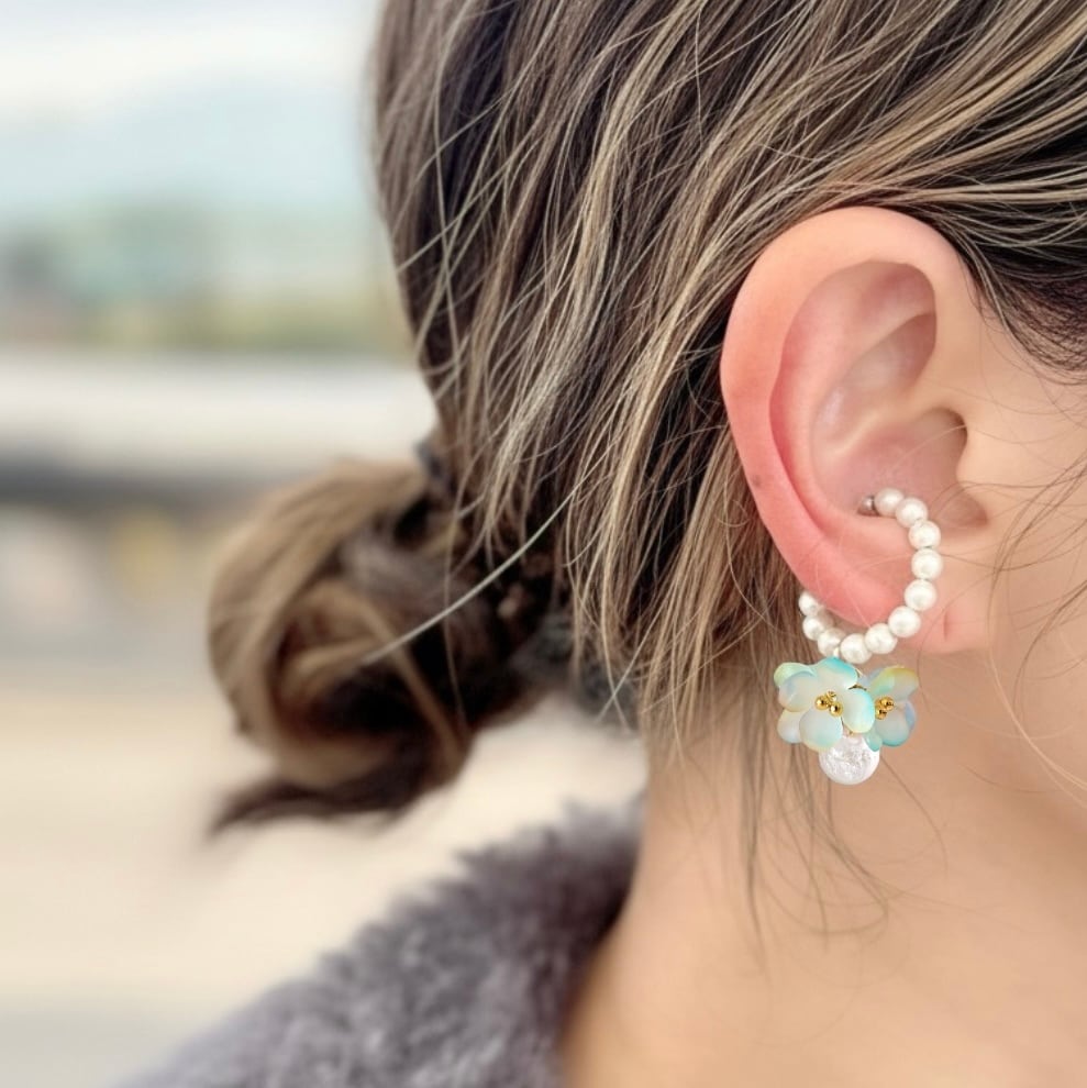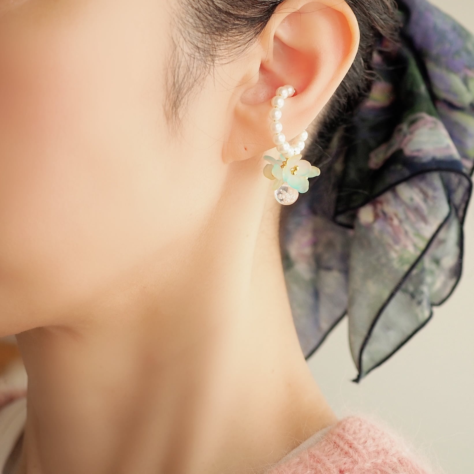 お花をはさんでパールの粒が多い方を耳の前側に着けていただくとキレイです