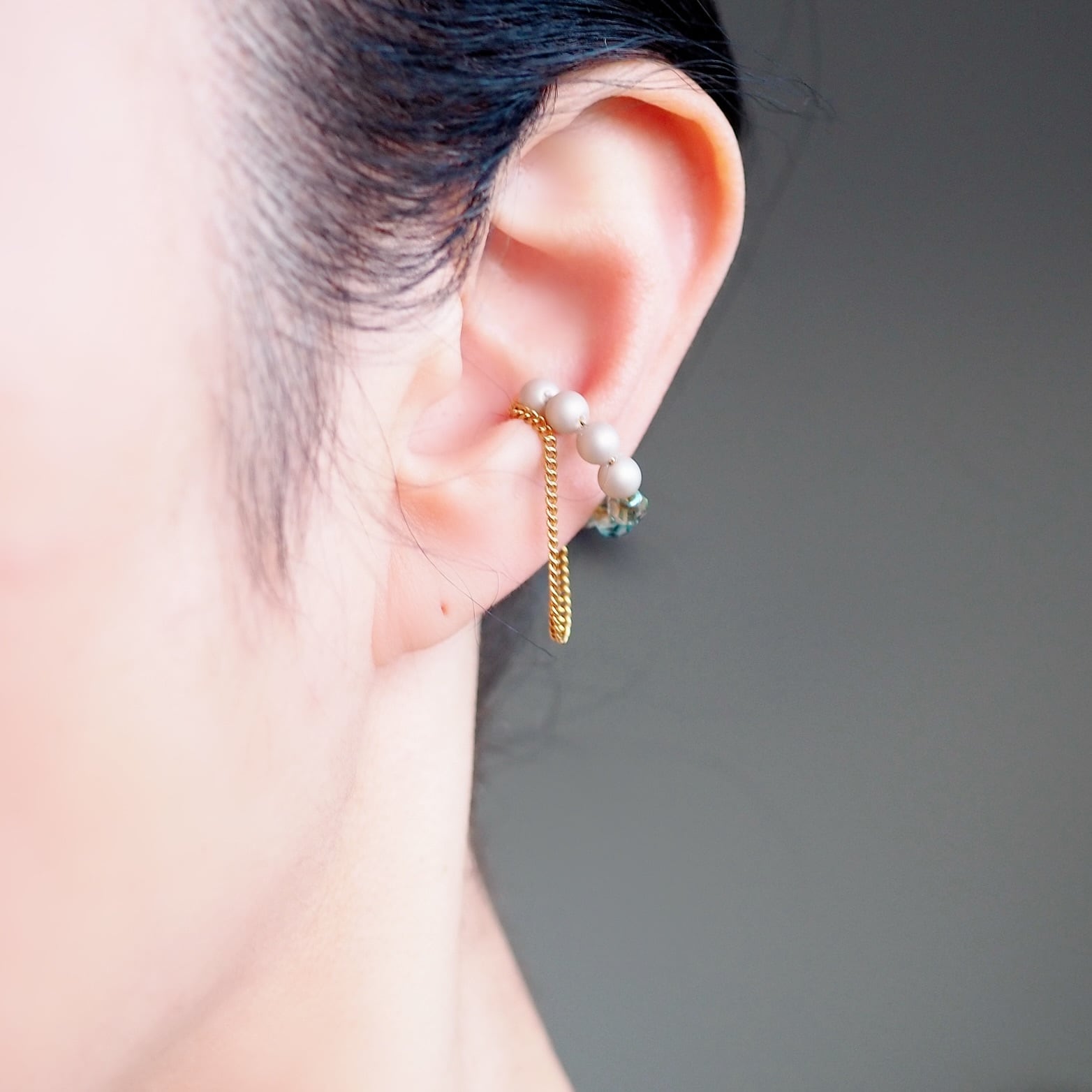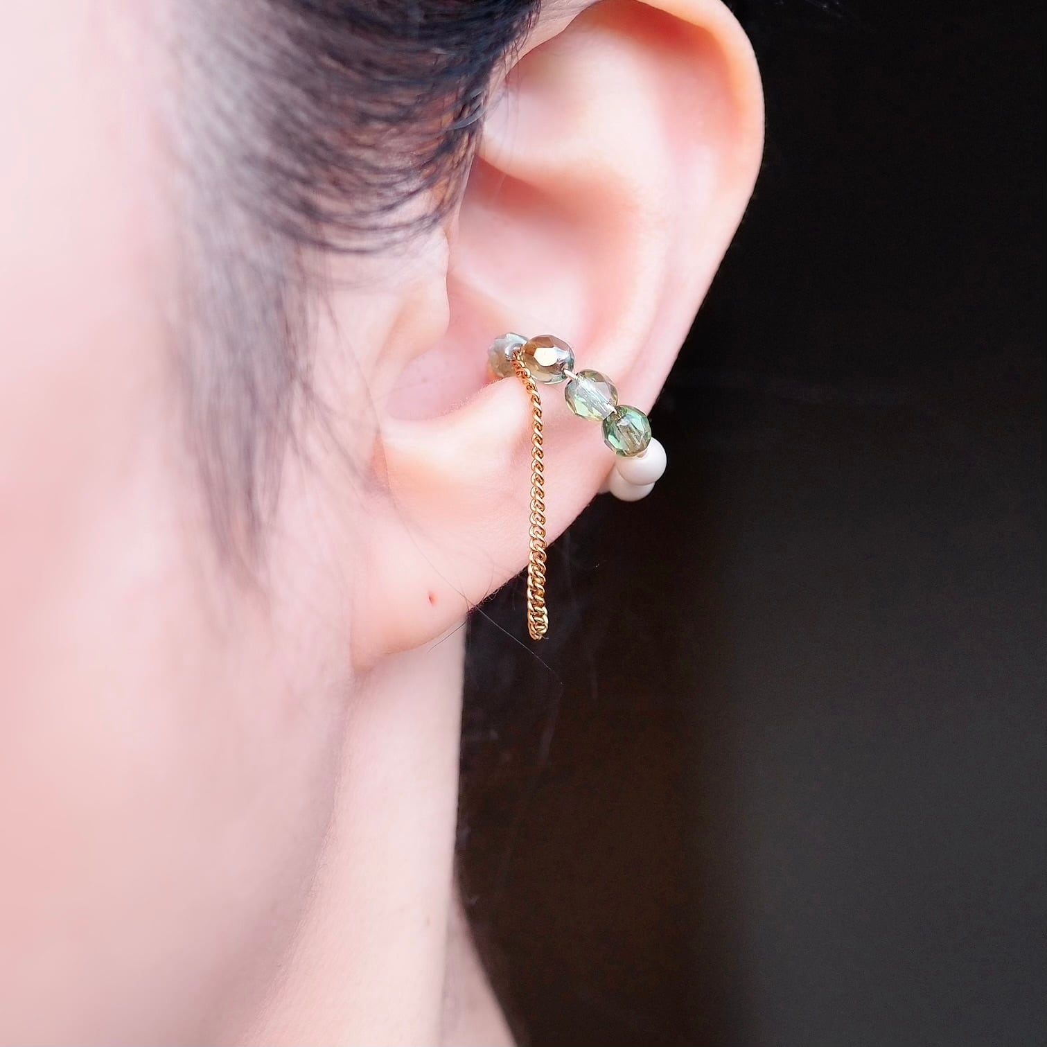 バイカラーチェーンイヤーカフ ミルクティ&エメラルド 片耳 P1202