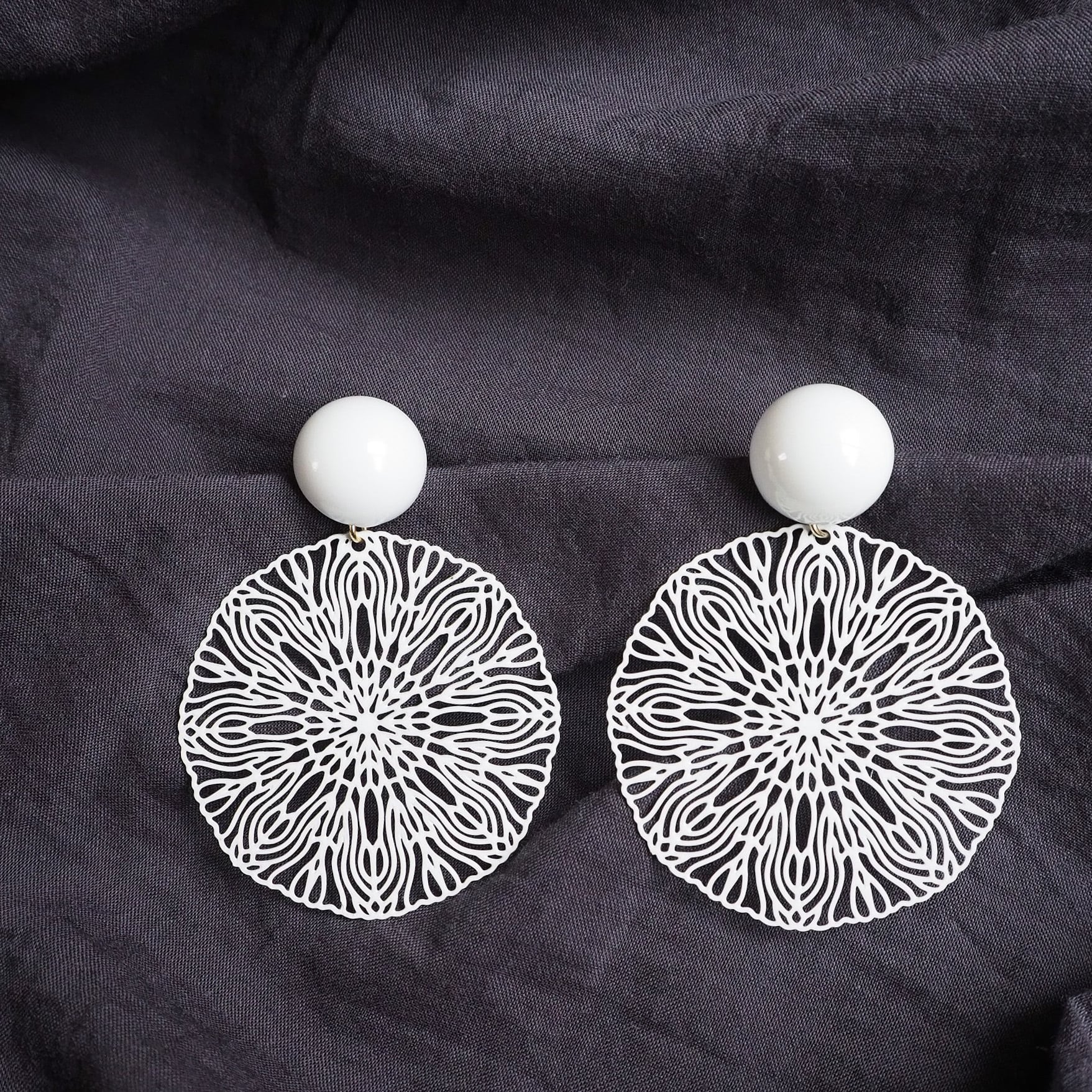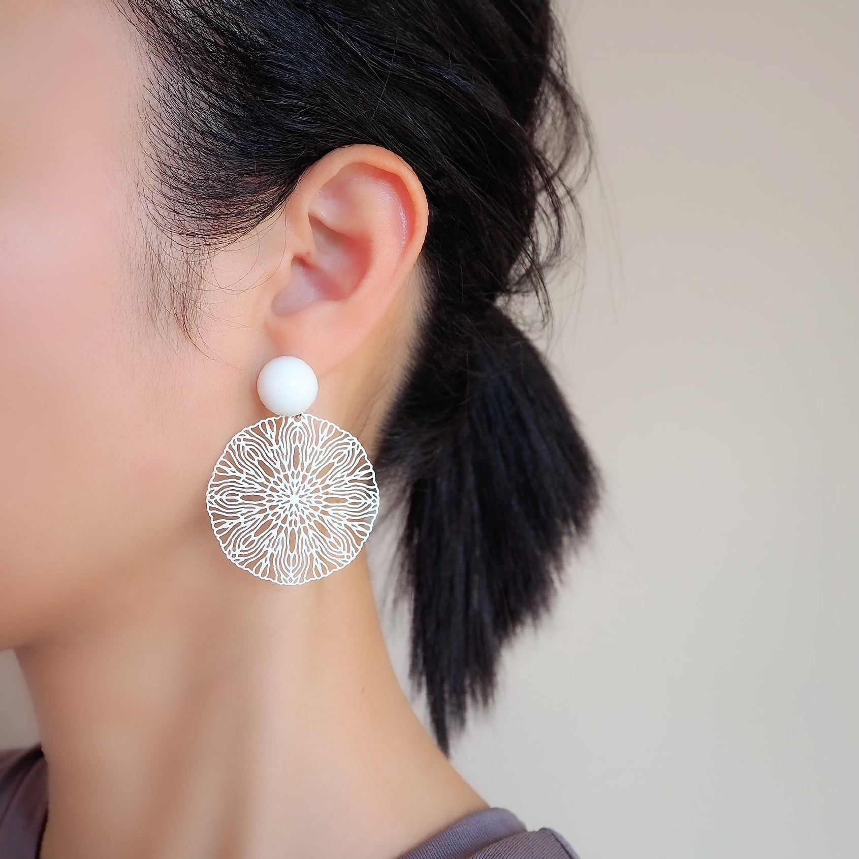オールホワイトのピアスは冬は雪のイメージ、夏は涼しげに、