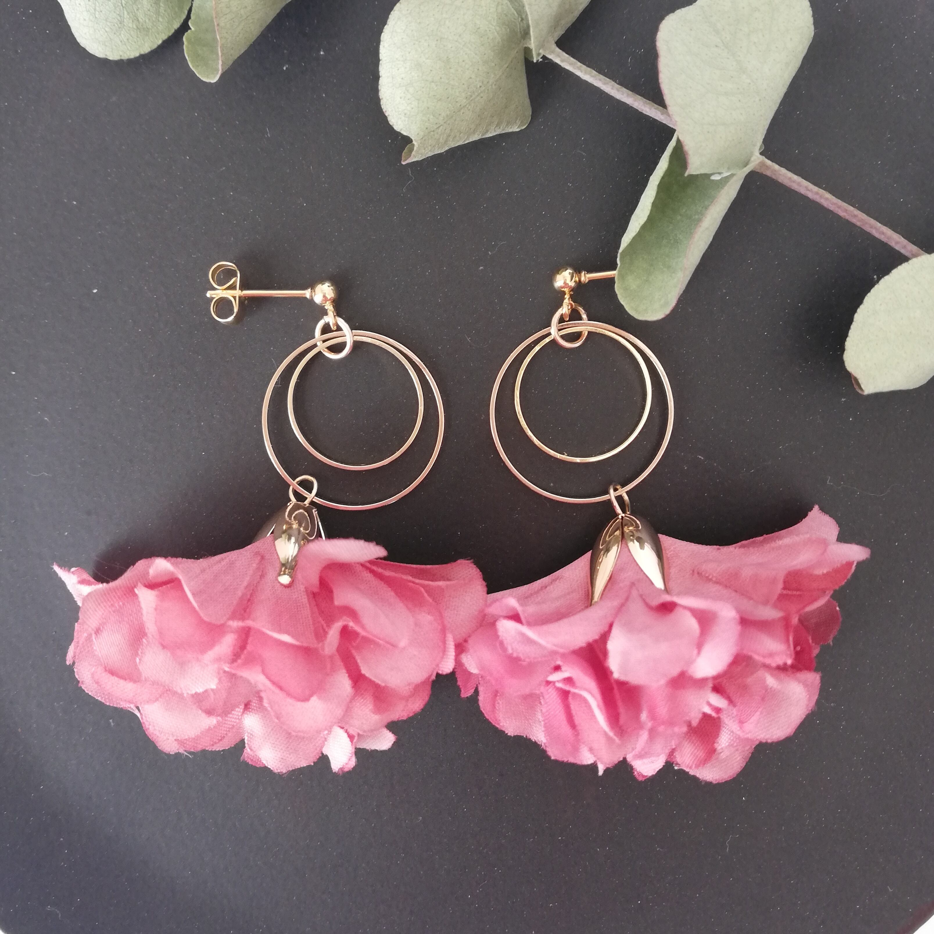 サイズ違いのフープとの組み合わせで揺れて踊っている様なお花のピアスに仕上げました。