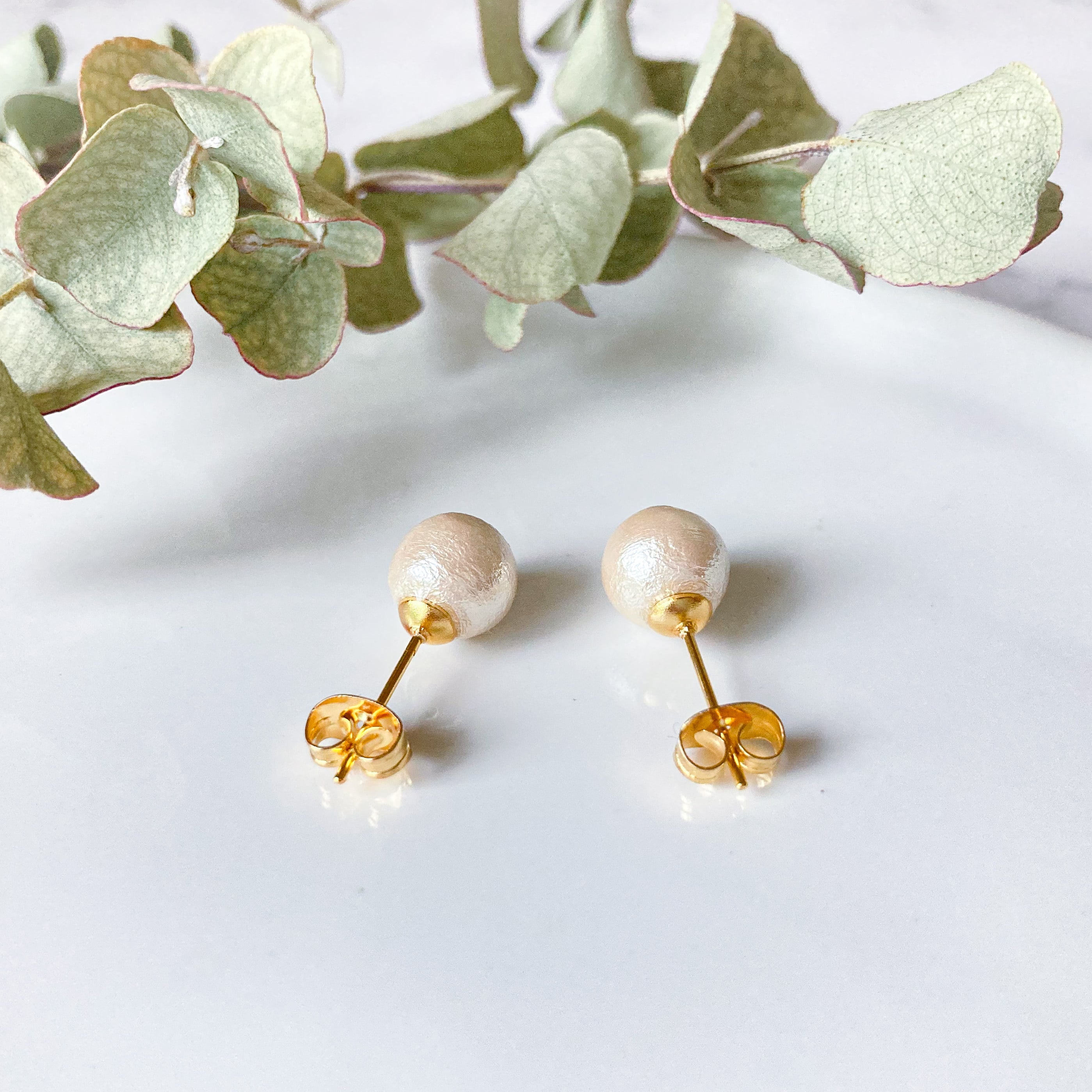 小さくてさりげない8ミリのコットンパールピアス、レガントにもカジュアルにも。