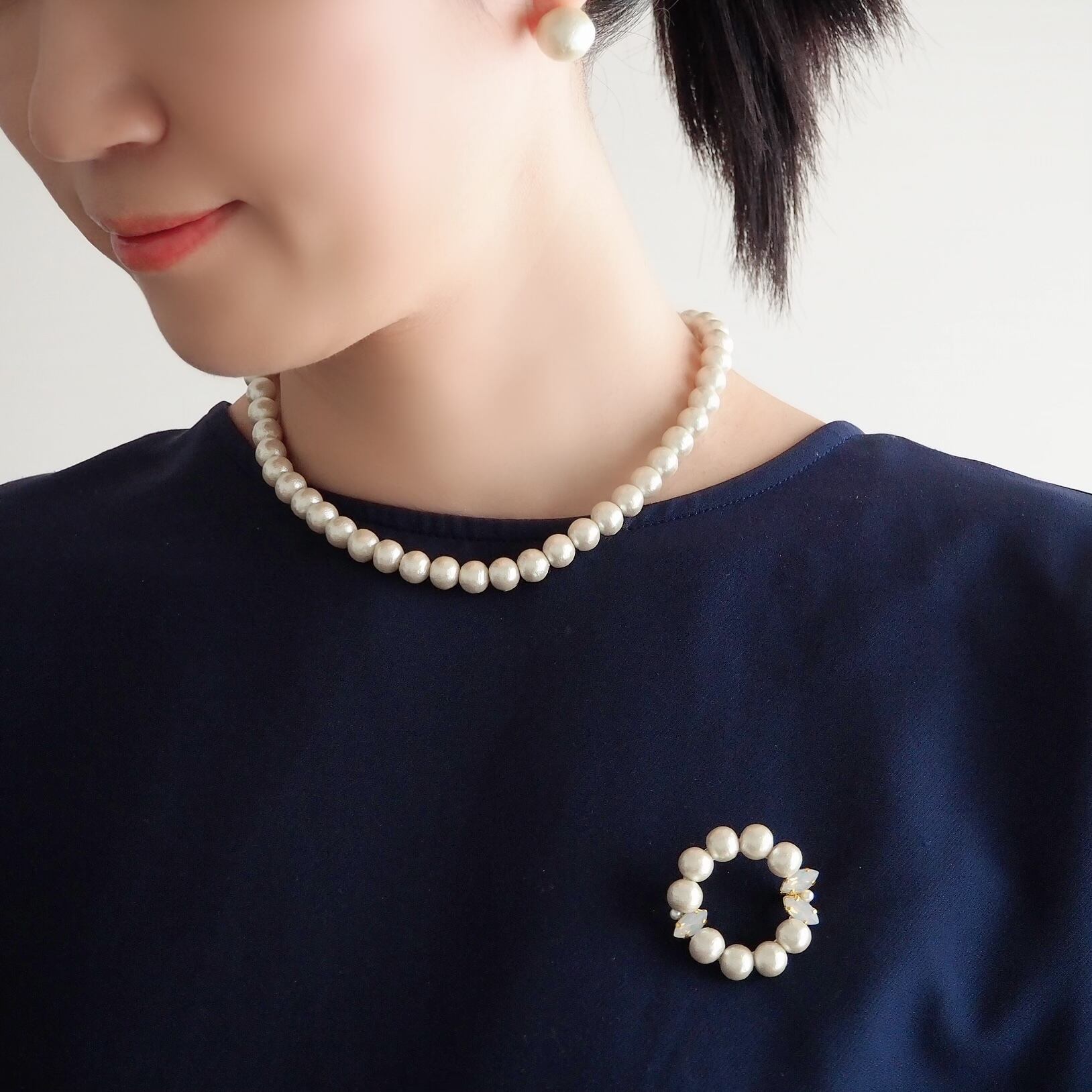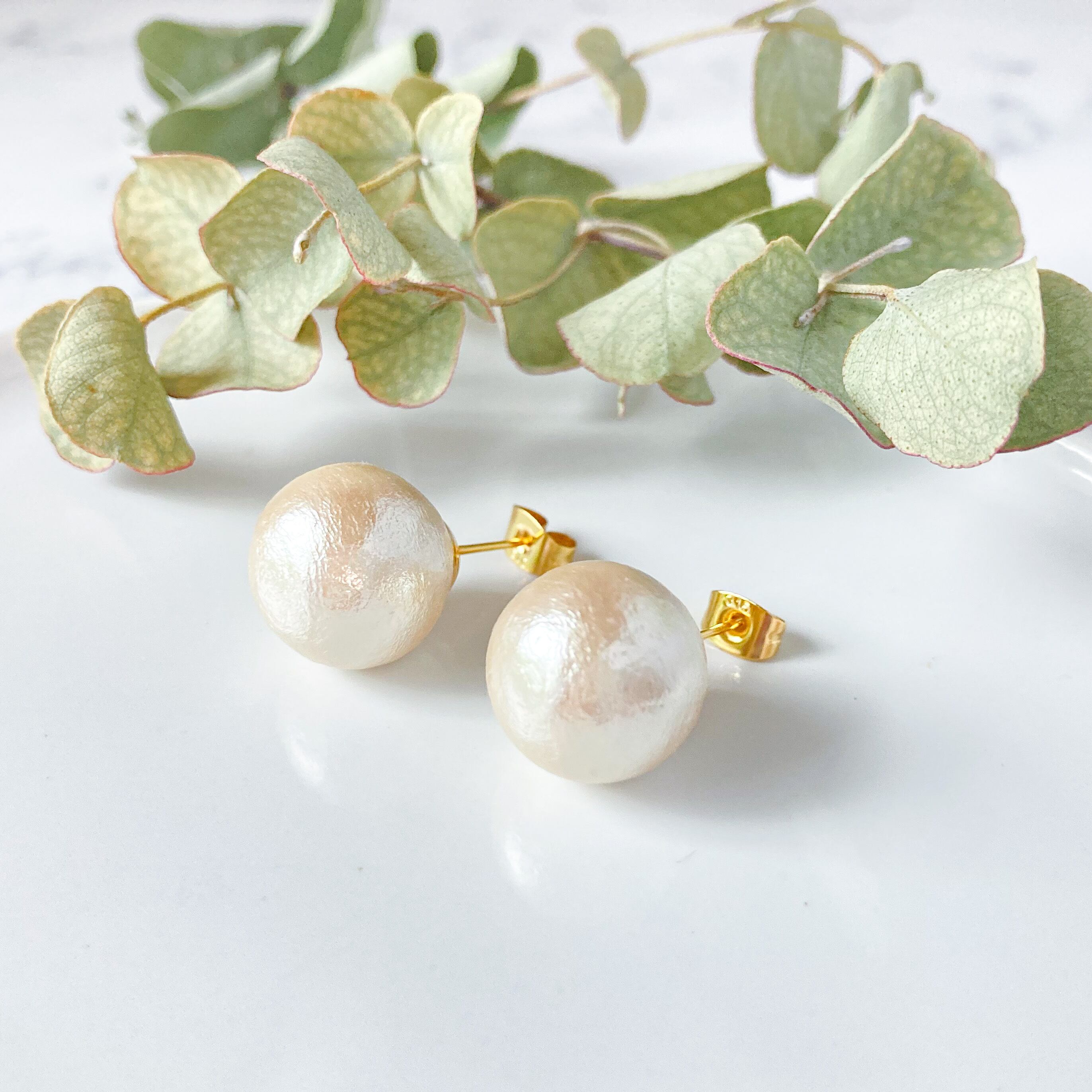 14ミリのコットンパールピアス。エレガントにもカジュアルにも。