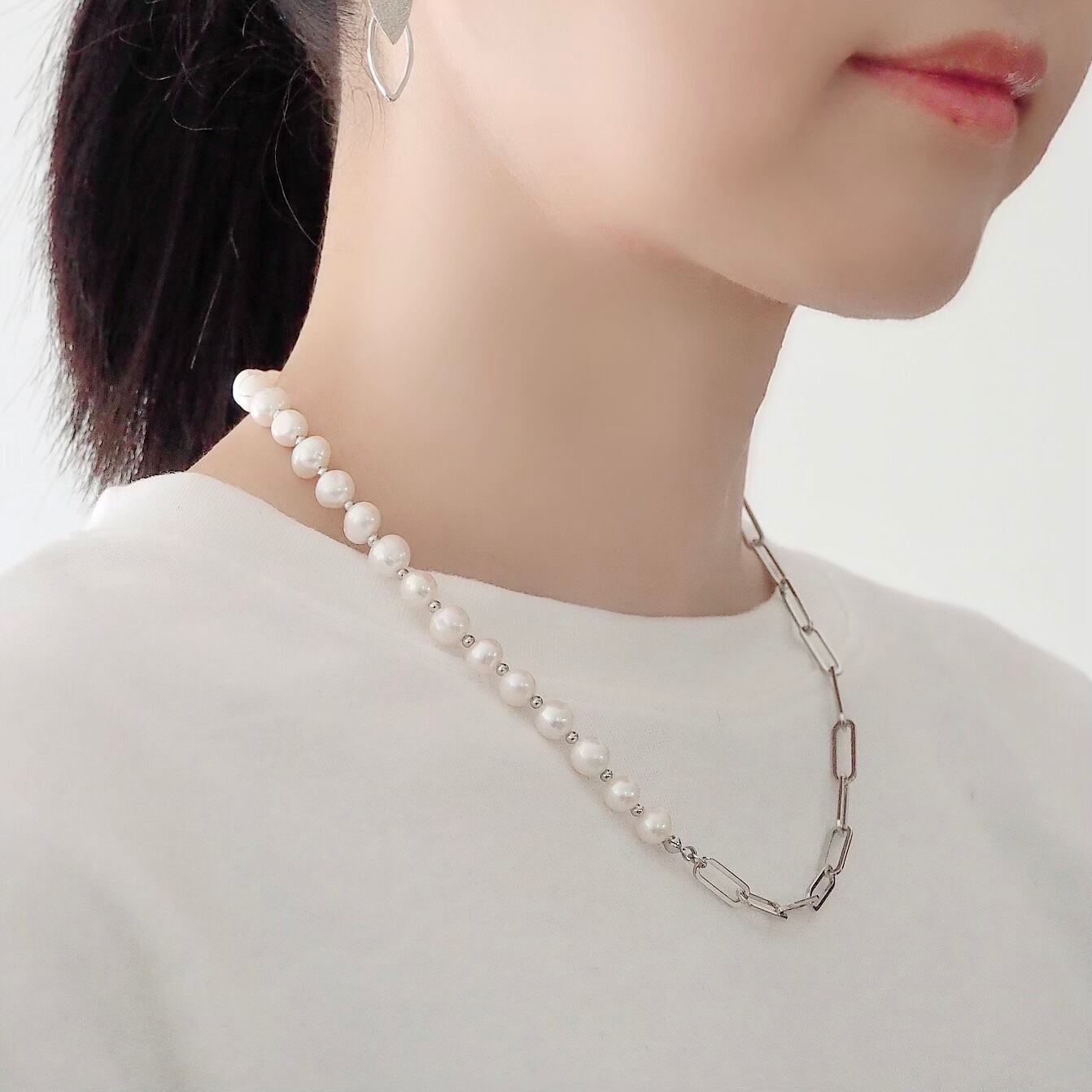 軽く優しいイメージの淡水パールとハンサムなイメージのチェーンの対象的な組合わせ。
