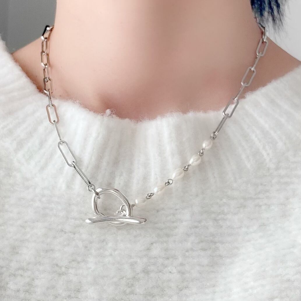 軽く優しいイメージの淡水パールと少しハードなシルバーチェーンの対象的な組合わせ。